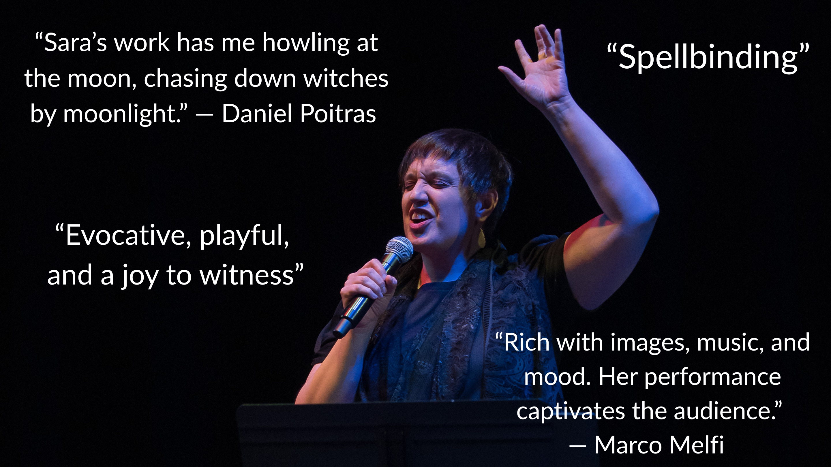 “Sara brings so much energy to the stage! Her poems are rich with images, music, and mood. Her performance captivates the audience.” — Marco Melfi